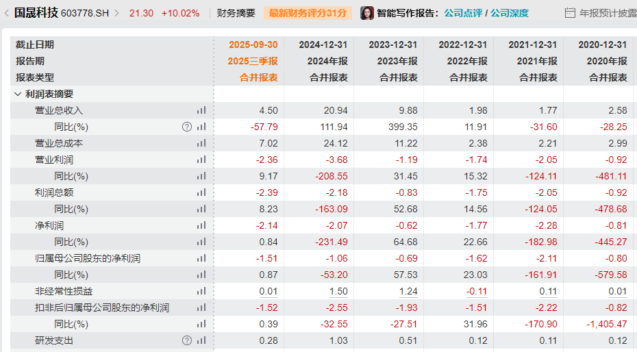 国晟科技表示,公司主营业务未发生变化,且处于亏损状态。公司2025年前三季度归属于上市公司股东的净利润为-1.51亿元,归属于上市公司股东的扣除非经常性损益的净利润为-1.52亿元。