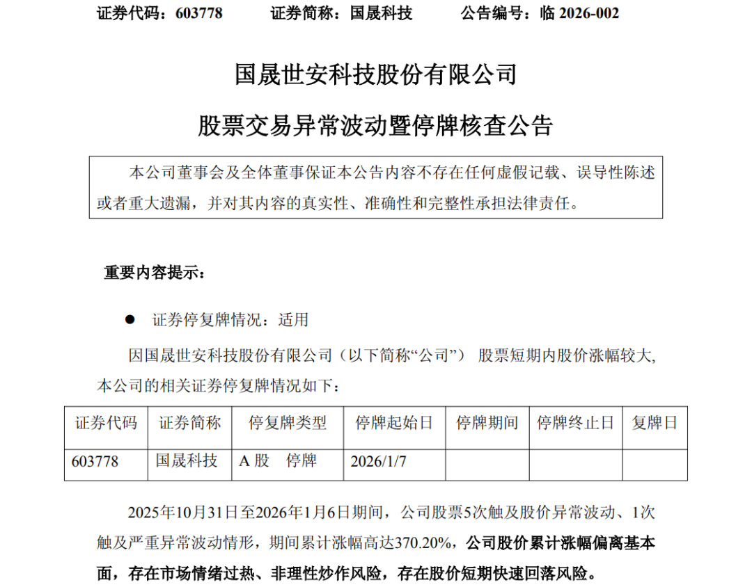 1月6日,国晟科技发布公告称,2025年10月31日至2026年1月6日期间,公司股票5次触及股价异常波动、1次触及严重异常波动情形,累计涨幅高达370.2%,公司股价累计涨幅偏离基本面,存在市场情绪过热、非理性炒作风险,以及股价短期快速回落风险。