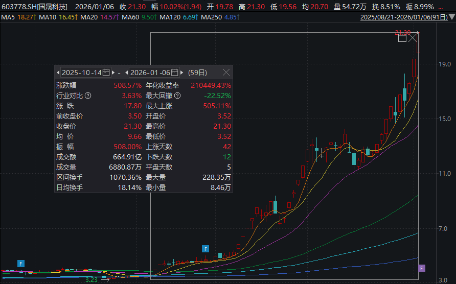 2025年10月14日以来,国晟科技已经累计大涨超500%。